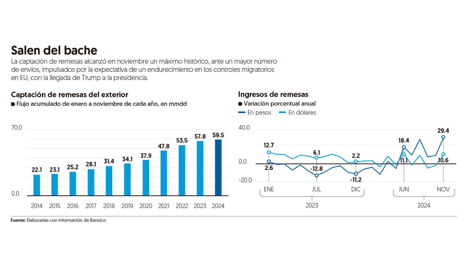 El ingreso de remesas a México se recuperó durante noviembre pasado y tras dos meses en contracción, en el penúltimo mes del 2024 repuntaron 1