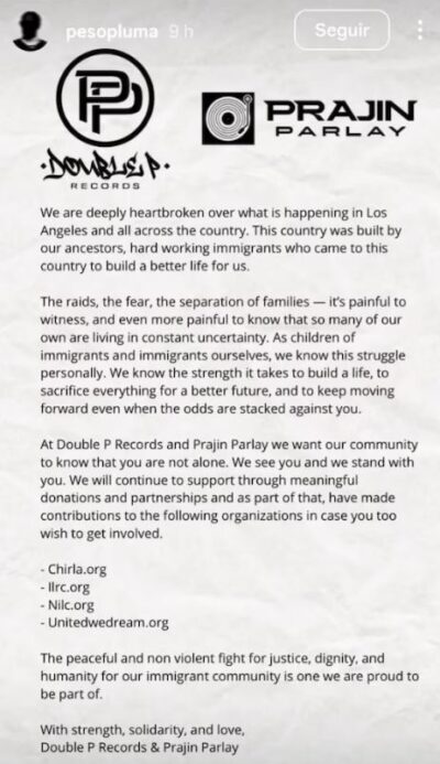 La postura de Peso Pluma se suma a la de otras figuras del espectáculo que también han manifestado su rechazo a las políticas de persecución contra migrantes.